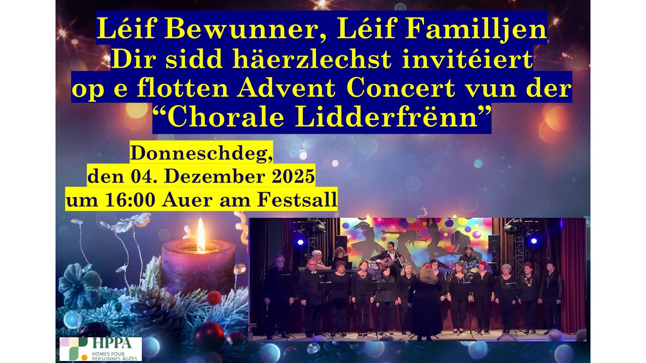 Dir sidd häerzlechst invitéiert op e flotten Advent Concert vun der “Chorale Lidderfrënn”