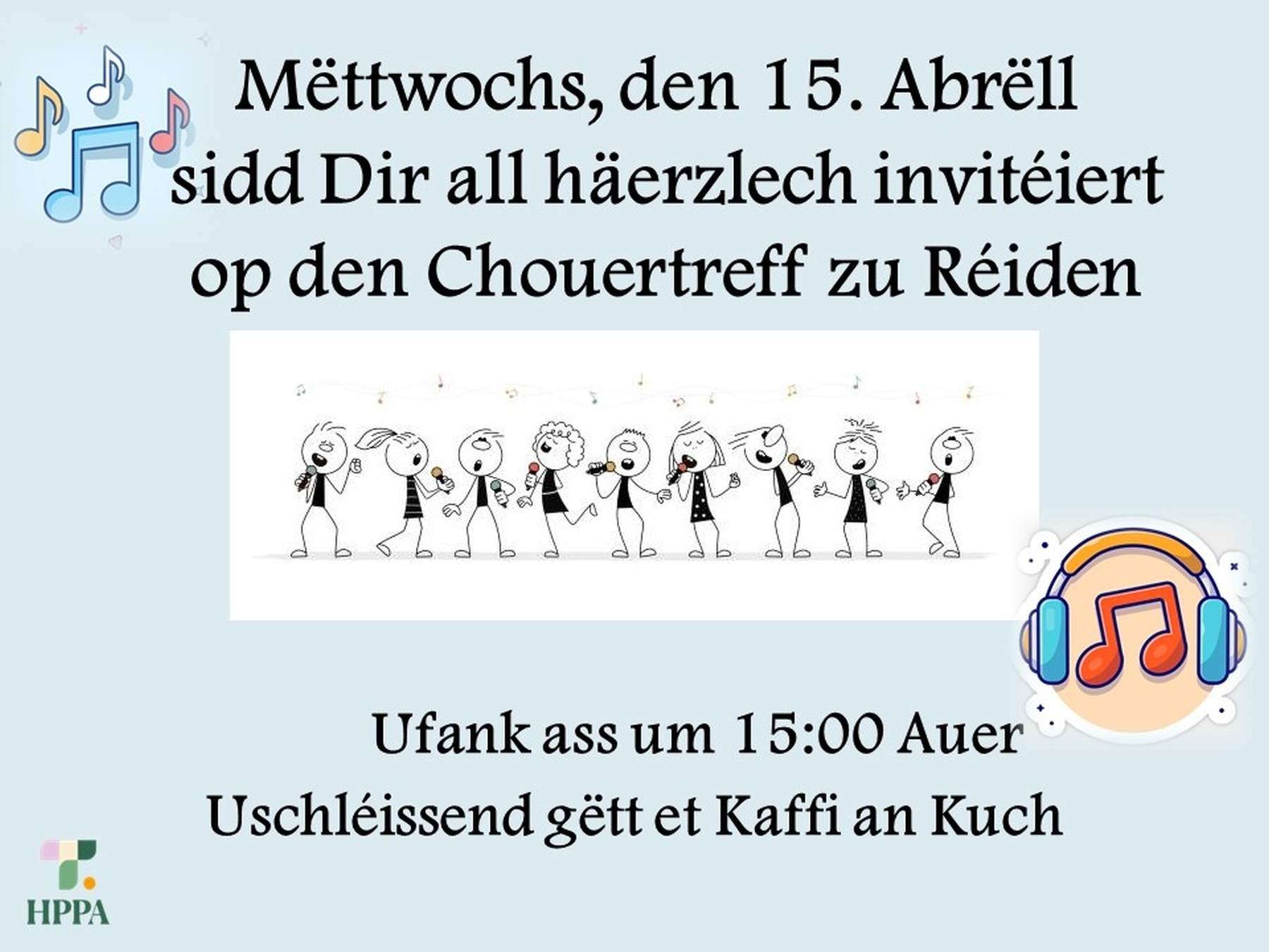Mëttwochs, den 15. Abrëll sidd Dir all häerzlech invitéiert op den Chouertreff zu Réiden