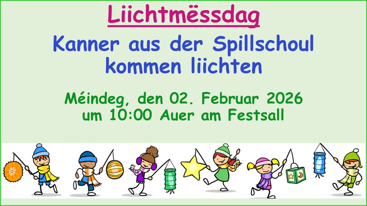 Méindeg, den 02. Februar 2026 um 10:00 Auer am Festsall kommen Kanner aus der Spillschoul liihten